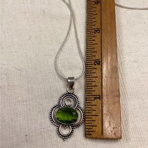 This elegant jewelry set features a stunning green gemstone set in a silver design. Perfect for adding a touch of sophistication to any outfit.