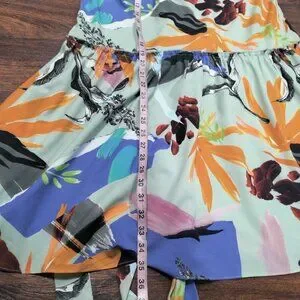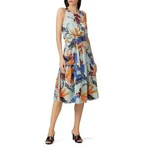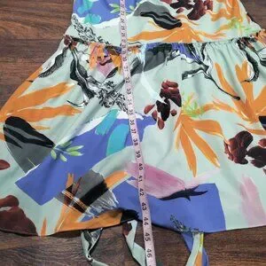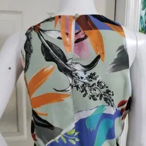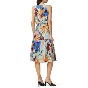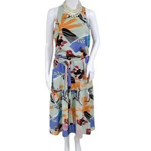 - Details: Sleeveless, Midi length, Geometric floral print, Lined, Crew neckline. Fully lined, Tiered, Keyhole back, Oversized tip billowing top, Belted