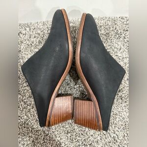 This is a pre-loved pair of UGG Lovisa women's slip on heeled mules. Size 8.5. Black leather with wood look 2" heel. These are in great condition EXCEPT for a small chunk of one heel is missing showing white underneath. See photos for details and condition. These retail for $120 and are so cute.