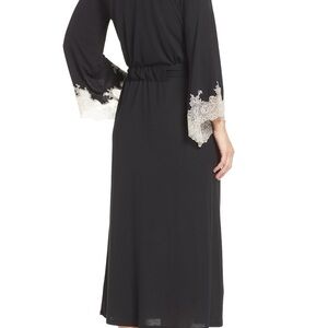 Experience the perfect blend of comfort and elegance with this Natori robe, featuring a wrap-style design and delicate white lace trim on the cuffs. The flowing black fabric and side slit offer ease of movement, making it ideal for both lounging and getting ready.
