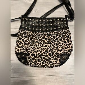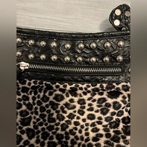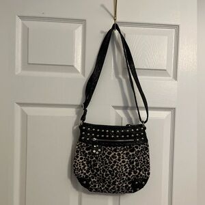 Stylish leopard print bag with black studded accents. Perfect for adding a bold touch to any outfit.