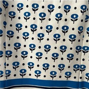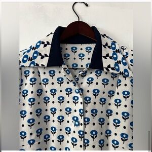 This is a fab vintage Blazer/Blouse-Featuring a wide winged collar, textured cloth button covers -the dress in block colours of blue and navy blue-white- tulip-mod print