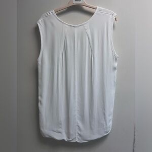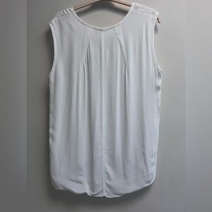 WILT Women’s White V-neck Sleeveless Blouse - Size Medium - NWT. This brand new white blouse, would like great left undone with trouser or jeans, or tucked into a skirt with a blazer. Sleeveless with a thick shoulder, into a v-neck. A shorter hem in the front that’s ruched, and longer in the back. NWT.