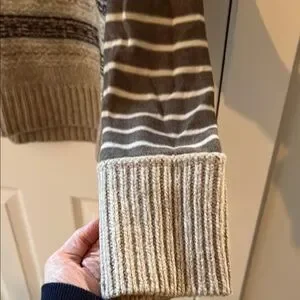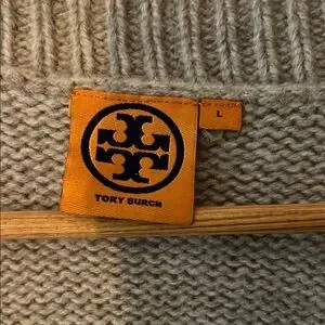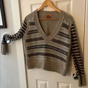 This Tory Burch V-neck sweater features a chic combination of brown, black, grey, taupe hues, perfect for adding a touch of elegance to your wardrobe. The sweater's V-neck design and ribbed knit detailing offer a classic look, while its medium weight ensures comfort during cooler weather. Ideal for casual outings, this sweater is a versatile addition to any collection. Non-smoking home.