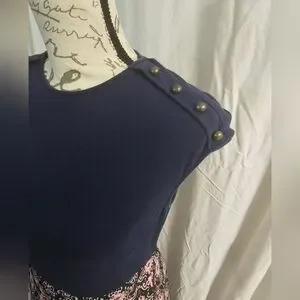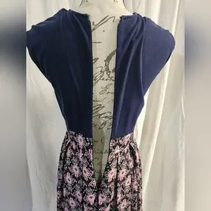 This knee-length A-line dress from eShakti combines a solid blue top with a pink floral patterned skirt, perfect for casual or work settings. The dress features a natural waistline and a classic, feminine design with a balanced distribution of soft pink blooms on a dark background. Its versatile style makes it an ideal choice for various occasions.