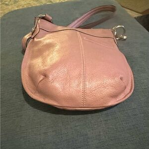 B. Makowsky women’s mauve/purple, leather, buckle, crossbody bag. Cool adjustable buckle strap, crossbody to shoulder strap length. Measurements: 10.75 "L x 11" H. Zipper closure, with a small interior zipper pocket and 3 slip pockets.