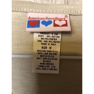 This is a new American Sweetheart blouse for women in size medium. The shirt has short sleeves and a V-neckline with lace accents. It is beige in color and made of a blend of polyester and cotton materials.
