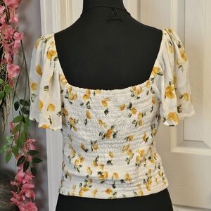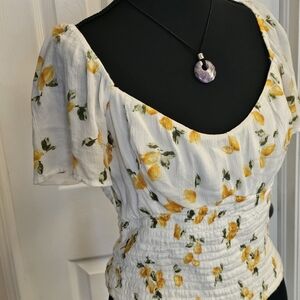 This elegant blouse features short flutter sleeves and a smocked waistband for a flattering fit. adorable lemon print, in excellent condition