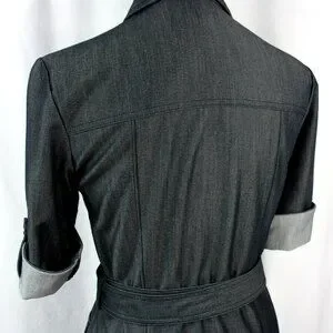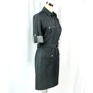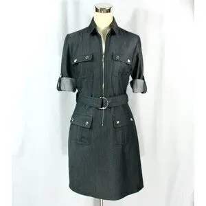 Sharagano Petite Zip Front Belted Pockets Chambray Shirtwaist Dress 4P 70s Style