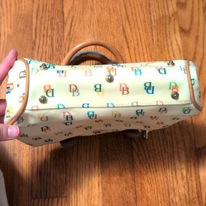 This elegant Dooney & Bourke satchel showcases a classic cream color, enhanced by the brand's iconic design. Crafted with a structured silhouette, it offers both style and functionality for any occasion.