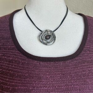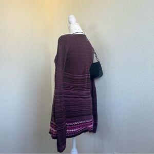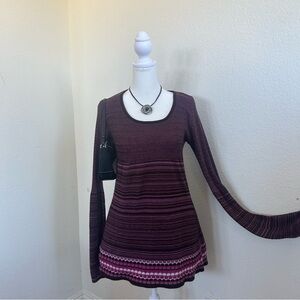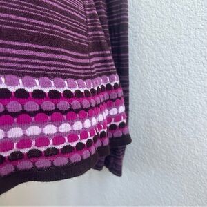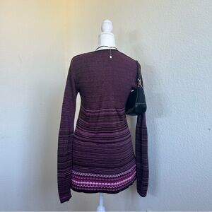 2000s Y2K Xhilaration long sleeve striped abstract knit babydoll top. Circa 2004. Empire waist. Round neckline. Balloon sleeve. Knit features layers of stripes above an abstract pink, purple, and brown circle pattern. Lightweight knit. Sleeves get slightly more flared. Casual y2k style. Acrylic knit. Made in USA. Size medium. Shown modeled on a size 2-4 mannequin. Elastic cuffs have lost stretch.