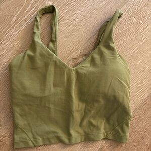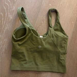 This green crop top from Lululemon Athletica combines style and comfort with its minimalist design and soft, stretchy fabric. Featuring wide shoulder straps and a V-neck silhouette, it's perfect for light athletic activities or casual lounging.