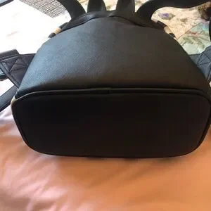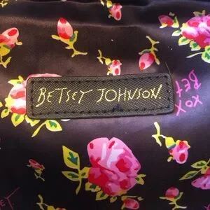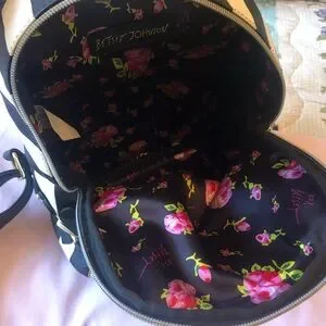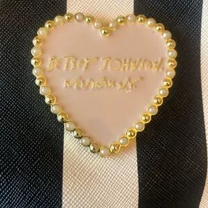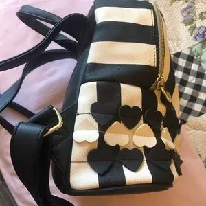 Adorable Betsey Johnson small backpack with black and white striped design, adorned with charming heart embellishments for a whimsical touch.
