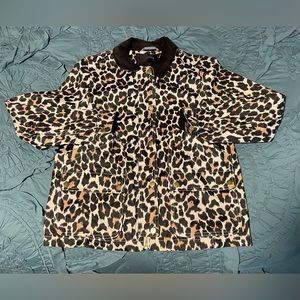 Stylish leopard print jacket. Features black collar and cuffs. Perfect for casual outings.