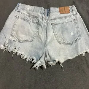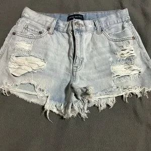 These Aeropostale blue jean shorts feature a heavily distressed design with a raw, cut-off hem for a casual, worn-in look. The light wash and frayed edges add a touch of vintage charm, making them perfect for relaxed outings.