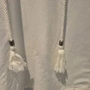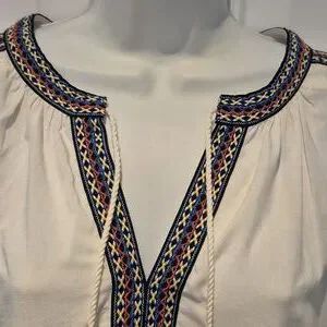 This elegant cream tunic blouse by Daniel Rainn features intricate embroidery along the V-neckline and on the shoulders, complemented by tasseled ties. Crafted from a soft, flowing fabric, it offers a casual yet sophisticated style with its loose-fitting sleeves and bohemian influence. Size L in great condition.