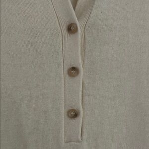 Elegant cream polo with navy trim. Features button-up front and short sleeves.