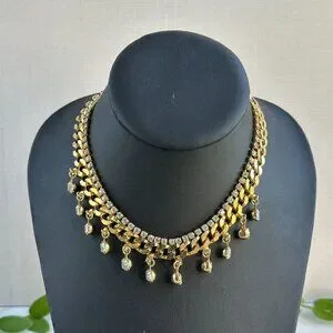 This necklace combines gold tones, sparkling rhinestones, and dangling accents to create an adaptable, elegant piece for formal or casual wear. Good condition. The rhinestones, when the necklace dangles, sometimes face the wrong way.