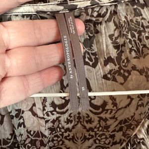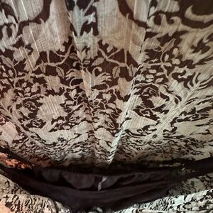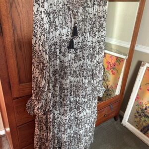 This stunning Anthropologie gown features a black and white floral print. The dress boasts a v-neckline and long bishop sleeves, with a tiered skirt that flows elegantly to the floor. Its lightweight fabric and ethereal silhouette offer a sophisticated yet relaxed bohemian style. Long flowing chiffon. Comes with original slip.