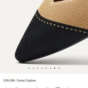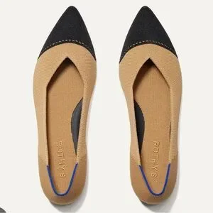 Experience the perfect blend of style and comfort with Rothy's tan and black flats. These shoes feature a sleek, minimalist design with a rounded toe and a two-tone color-blocking effect. Ideal for versatile wear, they offer a snug fit with their inward-curving sides.