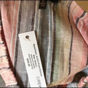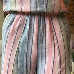 Drew Strapless Pastel Rainbow Pink Blue Jumpsuit linen blend. 55% Linen 45% Rayon The first picture is not the actual color, that’s just to show the style. Measurements are approximately and taken laying flat: Pants: inseam 32.5” Rise 12.5” Waist (relaxed) 15.5” (stretched)19.5” Hips 21.5” Top: Length 14”