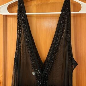 Chic black mini dress with intricate lace detailing. Perfect for a night out.