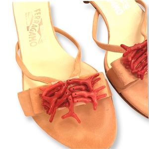 These chic Salvatore Ferragamo mules feature a stylish open-toe design with a decorative bow on top, crafted in a soft pink hue. Perfect for casual summer outings, they offer a blend of elegance and comfort with their flat sole and leather-like material.