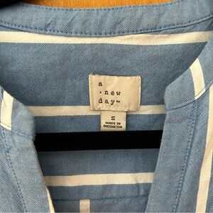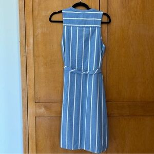 Blue and white stripe shirt dress button up with pockets, waist tie