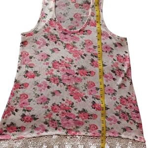 Sleeveless floral tank top. Features pink roses and green leaves. Lightweight and breathable fabric.