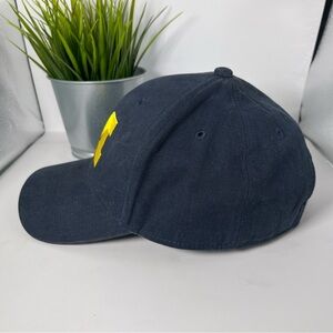 University of Michigan Wolverines Kids Adjustable Baseball Cap. Navy Blue with Yellow Embroidered M. Adjustable Velcro Back. Some light wear but in otherwise excellent used condition.