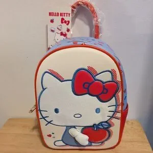 Adorable Hello Kitty backpack with a charming red bow. Features cream and blue design. Ideal for Hello Kitty enthusiasts.