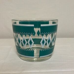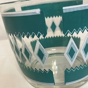 Elegant glass ice bucket featuring teal and white geometric designs. Ideal for home decor or serving.
