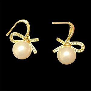 SHASHI Small Faux Pave Goldplated Ribbon Bow Pearl Drop Jewelry Earrings