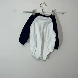 Size 6-12 months White with teddy bear embroidered on chest and blue long sleeves Snap closure on neck and bottom Used