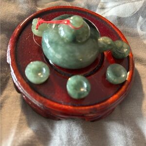 Jade Green Teapot Figurine on Wooden Base