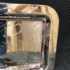 Stylish silver tray with engraved design. Perfect for a decor accent. Brand new in a shrink-wrapped box with original label. Photos from a display piece. A great gift for someone with a real fashion flair.