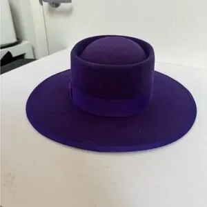Elegant purple hat with a wide brim. Features a matching ribbon band. Perfect for stylish outings.