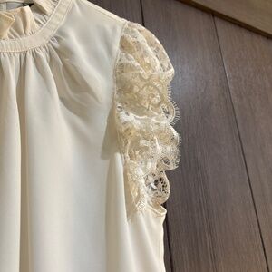 This off-white blouse from Express features feminine lace trim at armholes and a mock neck ruffle. Perfect for work tucked into high-waisted pants or a skirt.
