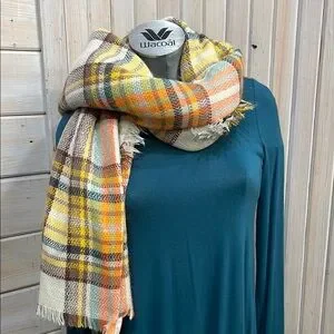 Vibrant plaid scarf with fringe. Perfect for adding color to any outfit.
