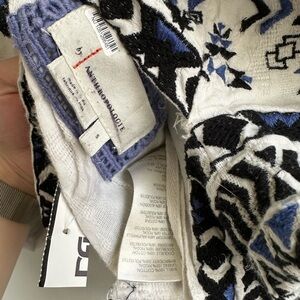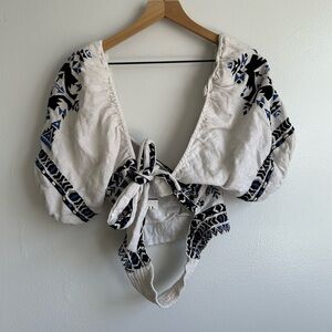 Stylish blouse with intricate embroidery. Features blue and black geometric patterns. Puff sleeves and button details.