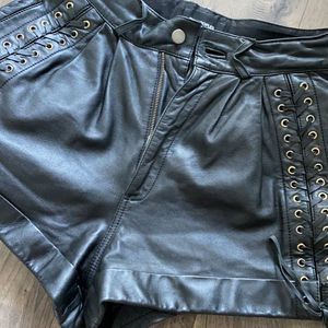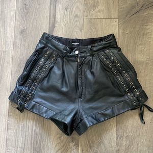 Sleek black leather shorts. High waist design. Lace-up side details. Perfect for a chic look.