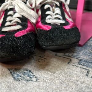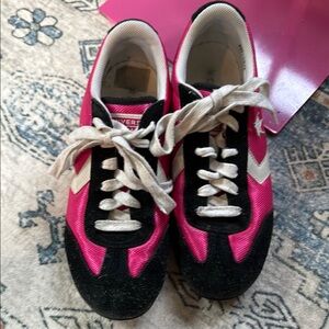 Bold pink and black design. White laces and accents. Classic Converse style.