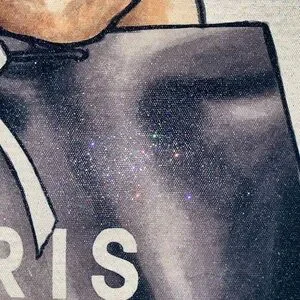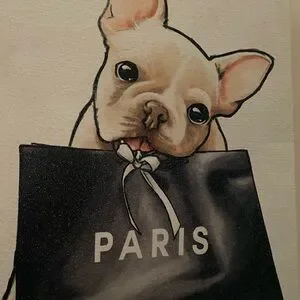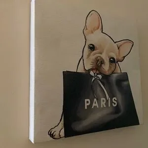 Adorable French Bulldog holding a black bag with 'Paris' text. Perfect for dog lovers and art enthusiasts.