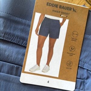 New with tags shorts with two-way stretch. Ideal for hiking. Features StormRepel DWR and UPF 50. Eddie Bauer brand. Cornflower blue. Lighter than photos show. Measurements in photo descriptions.