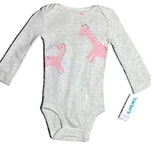 Adorable gray onesie featuring a cute pink giraffe print. Perfect for your little one's comfort and style. Made by Carter's.