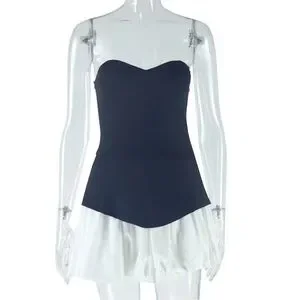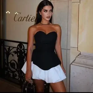 This elegant strapless mini dress features a sexy black bodice and a flowing white short skirt. Perfect for any special occasion, it offers a timeless and sophisticated look. The bodice has light padding built in. The top is strapless. Chic sexy elegant classic black and white mini dress.