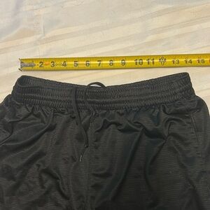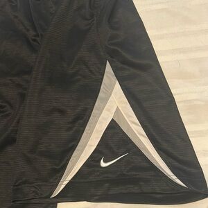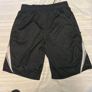 Pre-loved. Basketball shorts…Black, grey & white on outer legs, as well as the Nike symbol on one leg. Elastic tie waist. Pockets on either side.