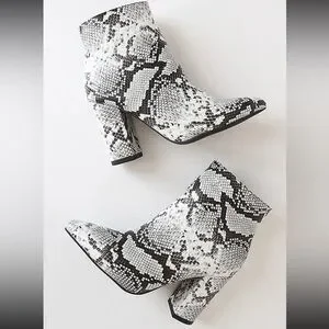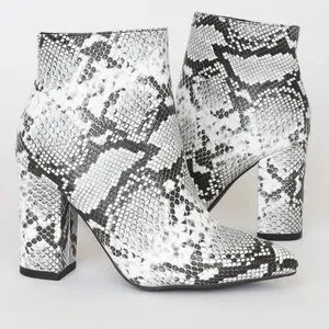 Lulus Exclusive! The sound of the Lulus Ottava Black and White Snake High Heel Booties strutting down the street is music to our ears! Sleek, black and white snake embossed vegan leather covers the pointed toe upper and ankle-high shaft.