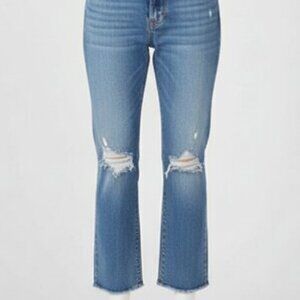 Mid-high rise, cropped bootcut/ankle hem, with intentional distressed detailing and clean finish