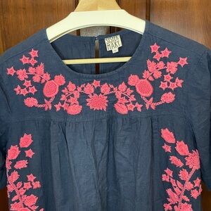 This elegant navy blue dress features exquisite pink floral embroidery, perfect for any occasion. The intricate design adds a touch of sophistication and style.